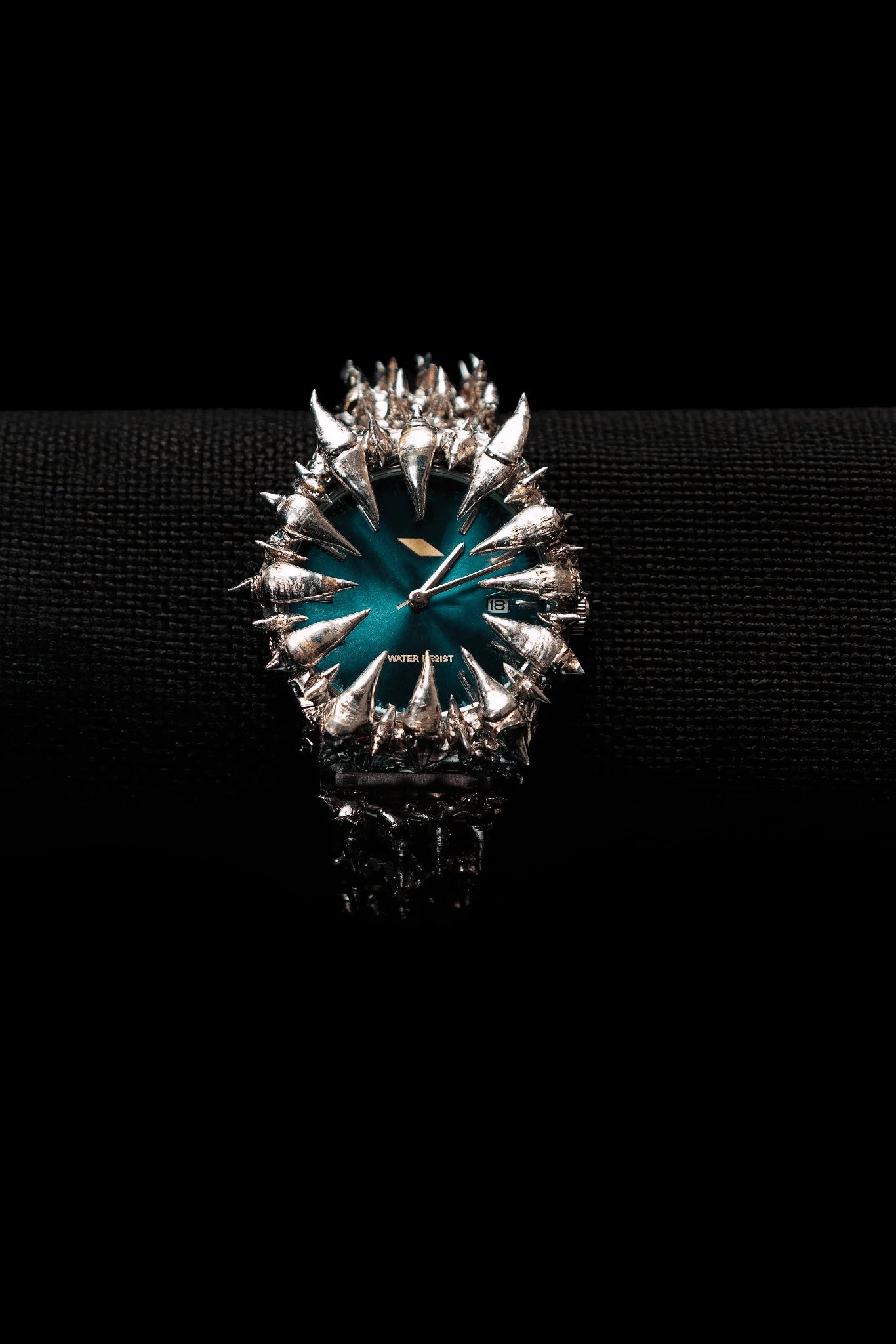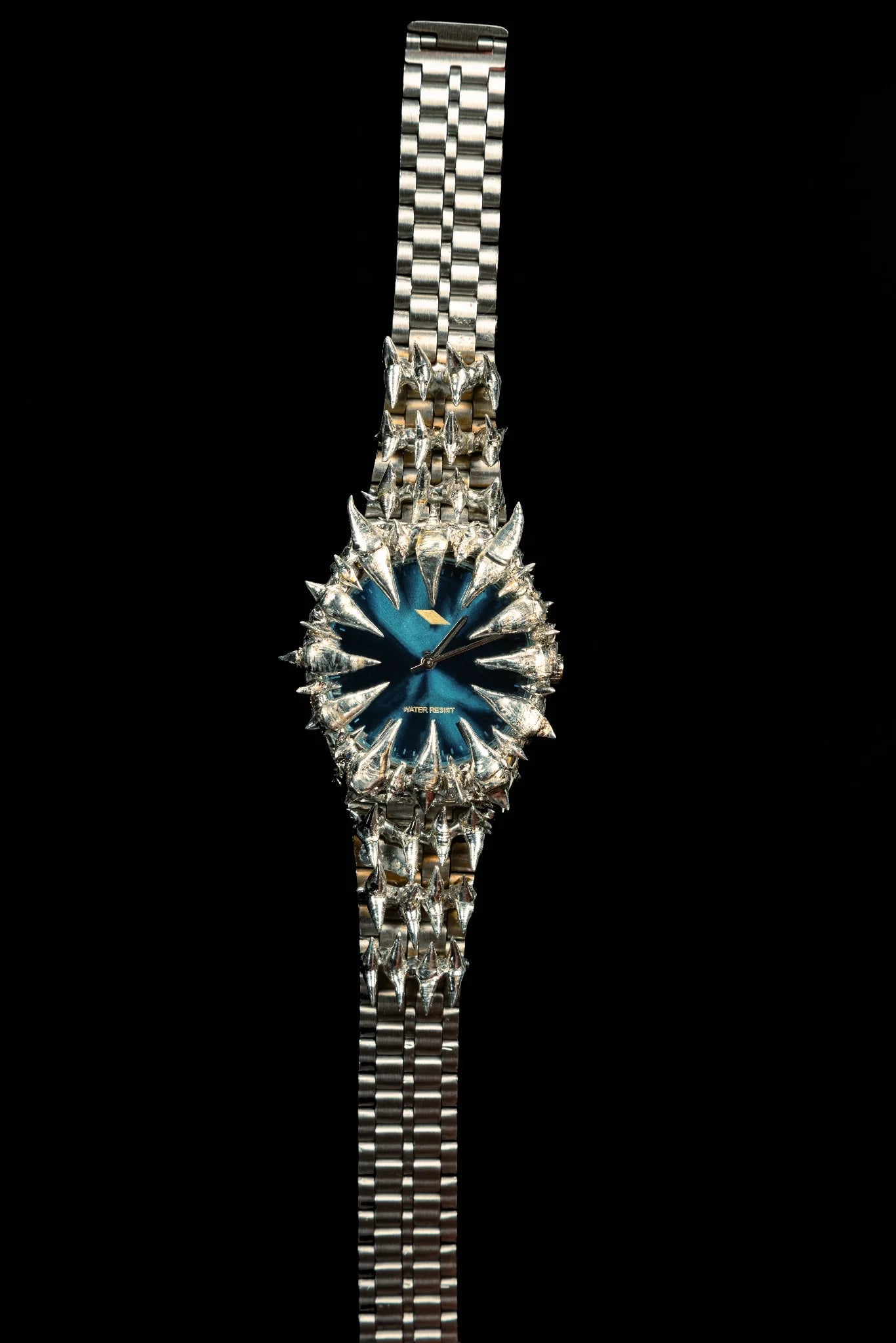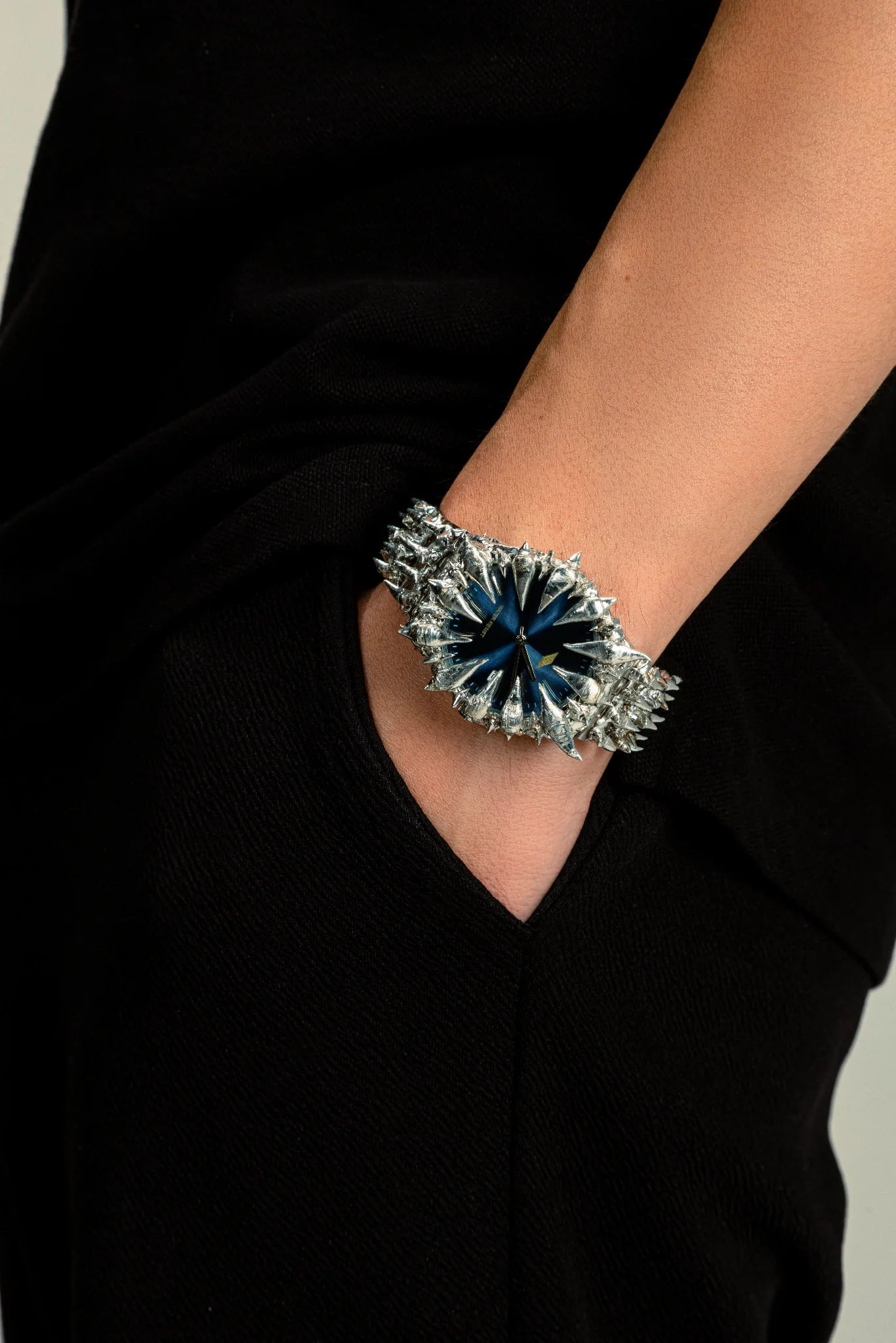 The mystery of midnight blue concentrates in sharp lines; its slim profile offers a modern sense of dynamism, while its clear surfaces leave a crisp, pure impression. Hand-soldered with meticulous craftsmanship.