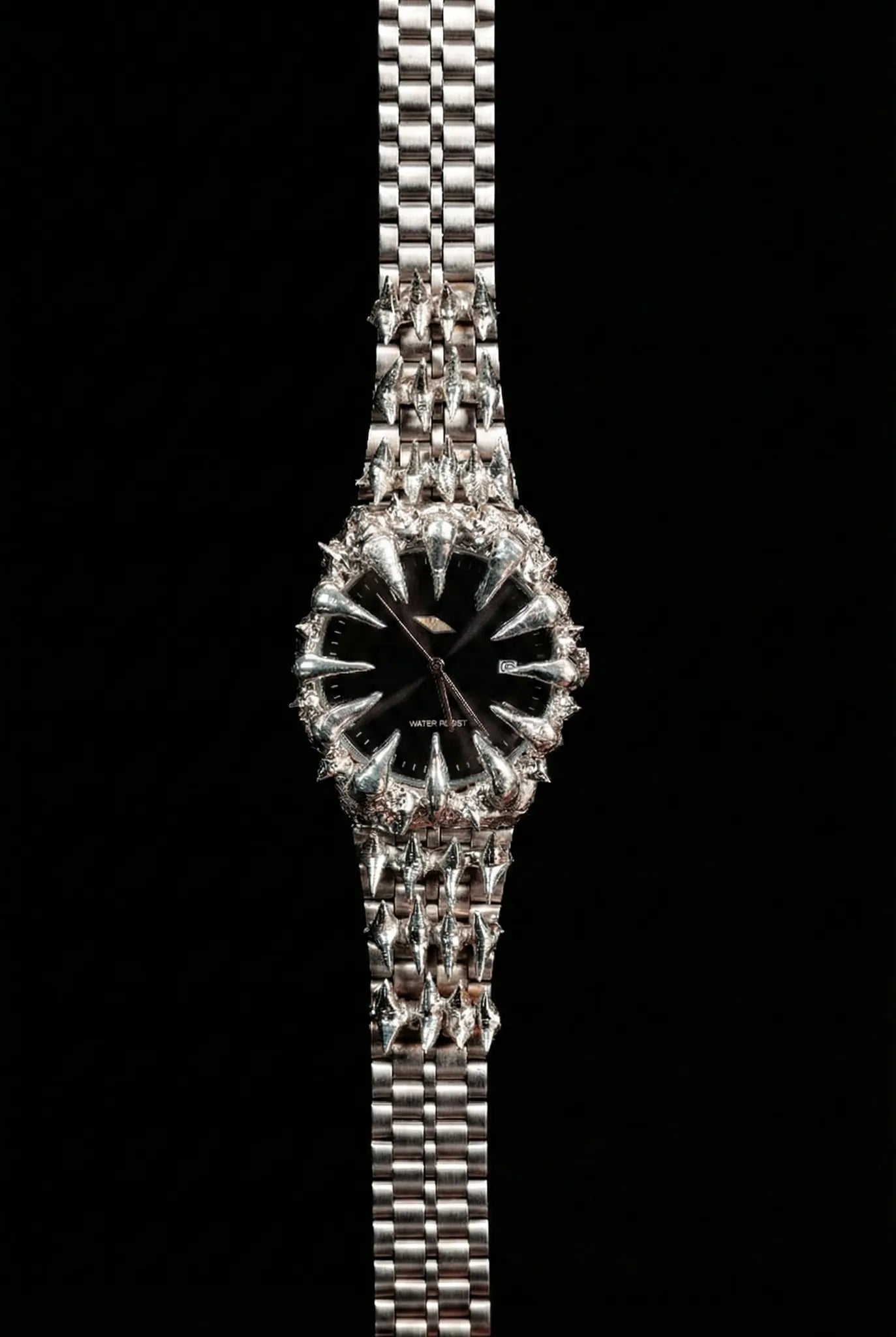 The sharp metal crown surrounding the black dial forms a bold ring that sits on your wrist like armor. With lines that are balanced yet wild, it gives a sense of dark nobility. It is crafted with meticulous hand-soldered workmanship.