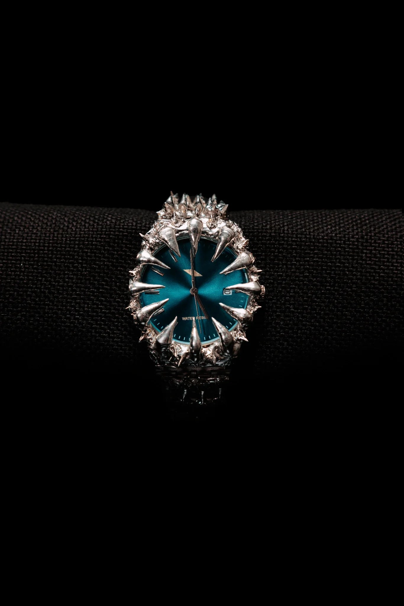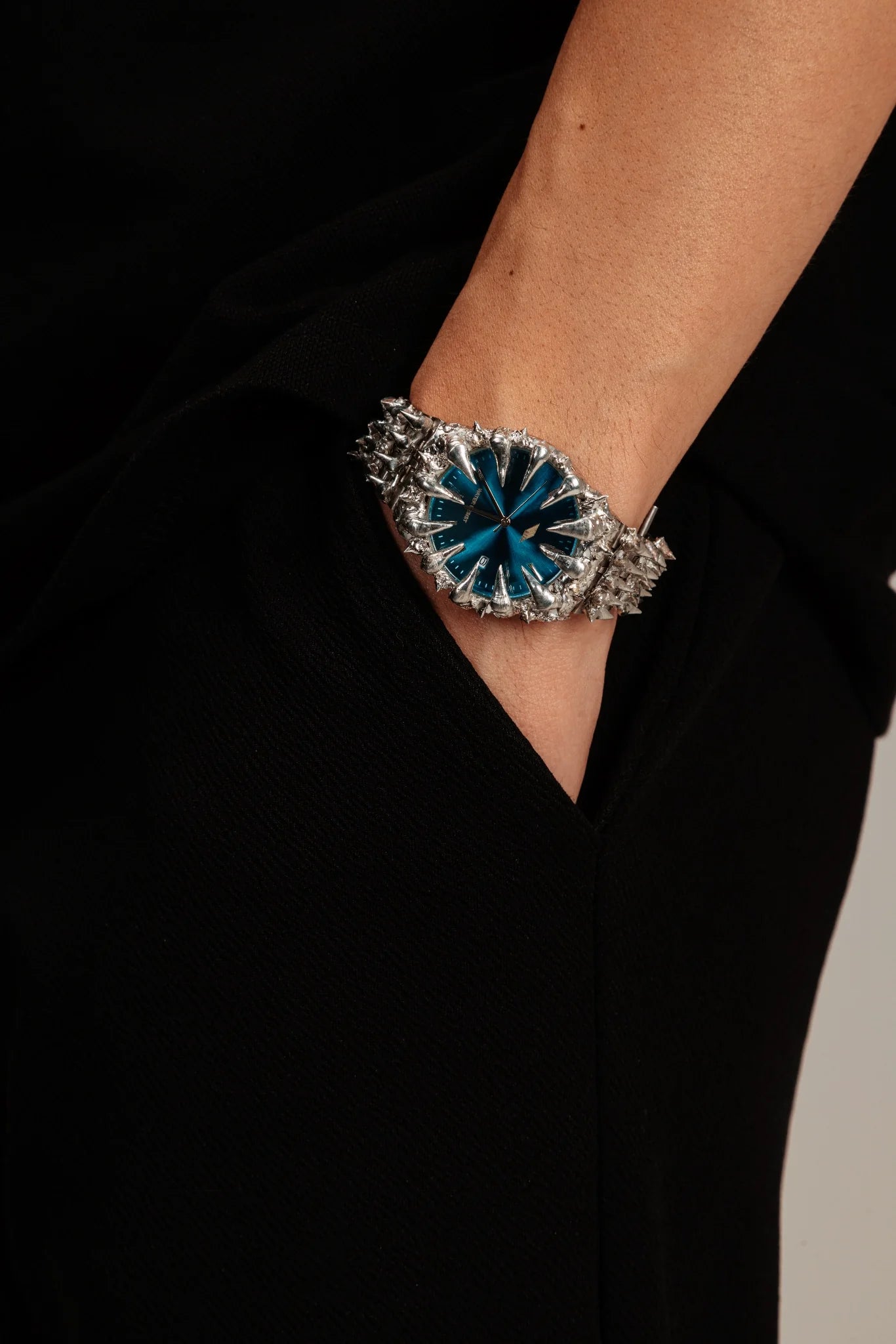It shimmers like a cool blue note; its modern lines create a graceful curve on the wrist, and its soft gleam leaves a subtle signature on your look with quiet confidence. Hand-soldered with meticulous craftsmanship.